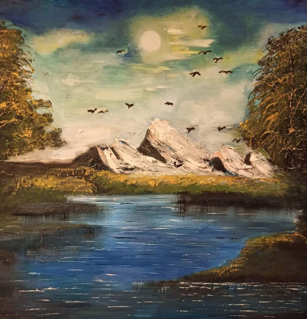 Tela 40×40 acrilico a spatola.Tipica dell’Europa Occidentale. In piemonte prende il nome di Gerbido. Ho creato questo quadro ispirandomi alle innumerevoli mattine in cui mi alzo all’alba e osservano vuoi vedo cosi il paesaggio. Il quadro è stato venduto su Catawiki.