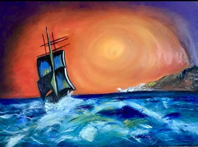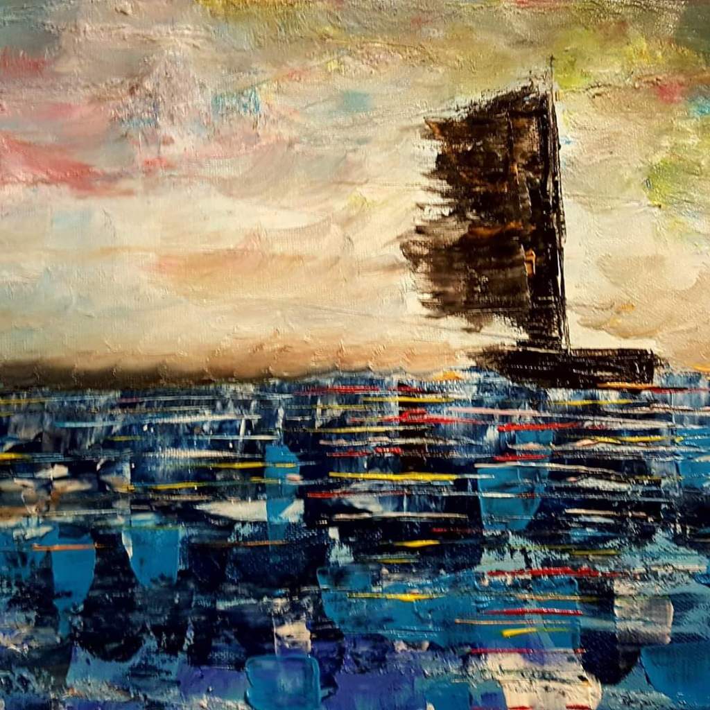 Quadro ad olio su tela a spatola.Rappesenta una barca che sta naufragando nel mare aperto,sotto l’occhio vigile del sole. La barca sono io che sto andando alla deriva inconsapevolmente e rappresenta la metamorfosi che sto attraversando. Quadro venduto privatamente.