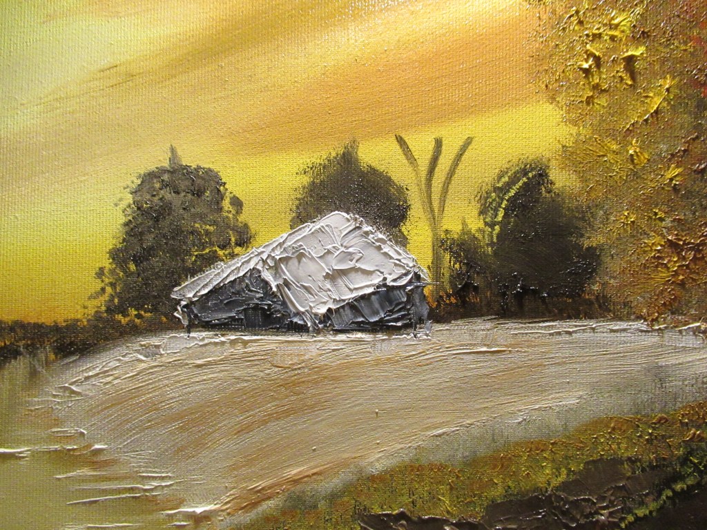 Tela di galleria 50×70 olio.Il quadro ricorda gli ultimi giorni di sole autunnale che splende nei campi di grano in campagna , quando i contadini portano a spasso i loro cuccioli.Realizzato con carta stagnola, pennelli e pettine a denti fini. il quadro è stato venduto da Saatchi Art Gallery a Brooklyn.
