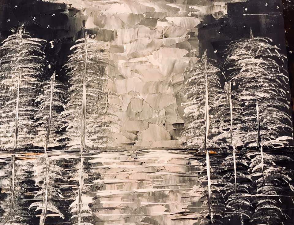 Tela di galleria 40×40 acrilico gesso a spatola. Quadro nasce di notte durante l’inverno quando tutto tace e come per magia cade la neve che imbianca tutti i pini, creando un effetto argento. il quadro è stato omaggiato ad una Influencer sulla piattaforma Instagram.