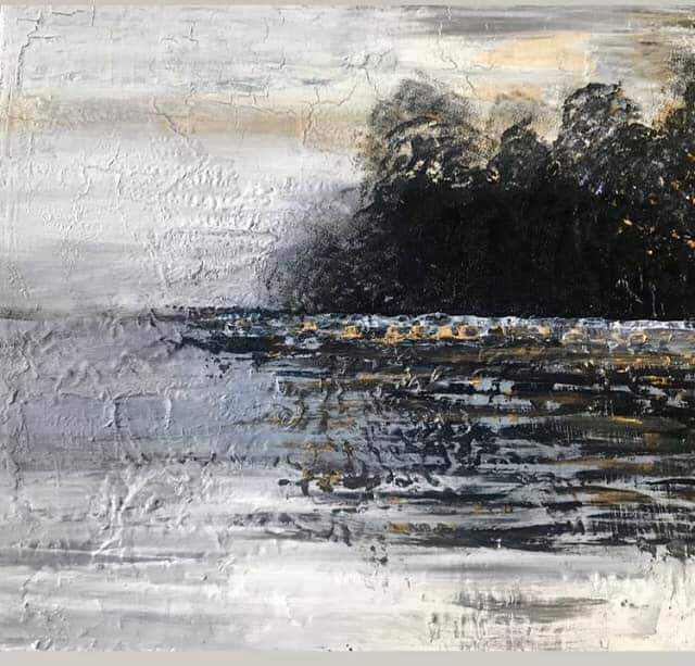 Tela di galleria 40×40 acrilico a spatola.Quadro facente parte della collezione “Black & White”. Le prime mattine d’autunno con nebbiolina difronte a casa nella valle del Ticino. Paesaggio al mattino presto. Il quadro è stato venduto su Catawiki.
