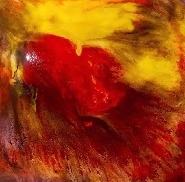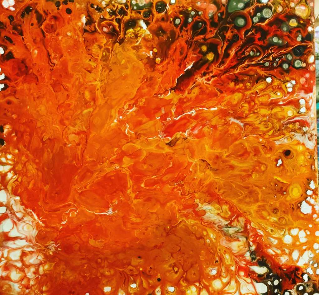 Tela in c assetta su MDF, 50×70. Realizzato In acrilico e tempera, con resina epossidica decorarla all’acqua. Realizzato con le mani senza l’uso di altri strumenti da pittura. Rappresenta il mio io interiore (carattere deciso come il fuoco, ma la mia parte più intima delicata come il corallo) Il quadro è stato venduto privatamente,