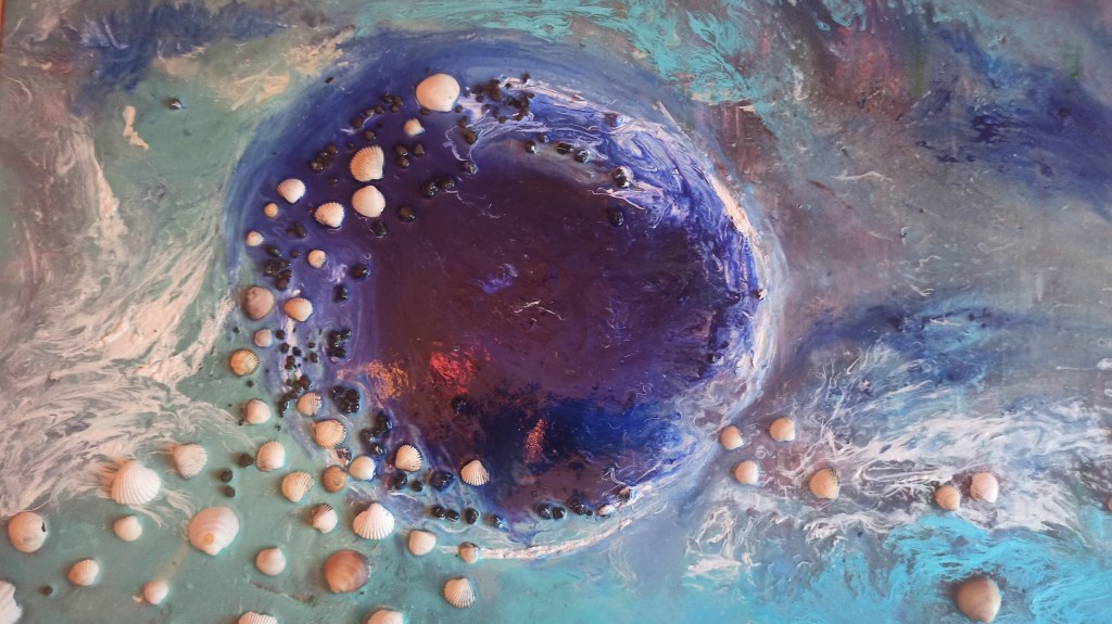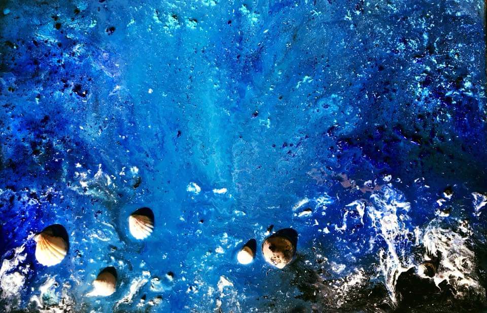 Tela di Galleria 40×70, realizzata con acrilico, resina epossidica decorativa all’acqua e conchiglie di mare. Rappresenta il mare uno dei momenti a me piu cari, fuggire al mare equivale fuggire da tutto, in un posto cosi tranquillo e profondo come il sottosuolo marino. Il quadro è stato venduto privatamente in Scozia.