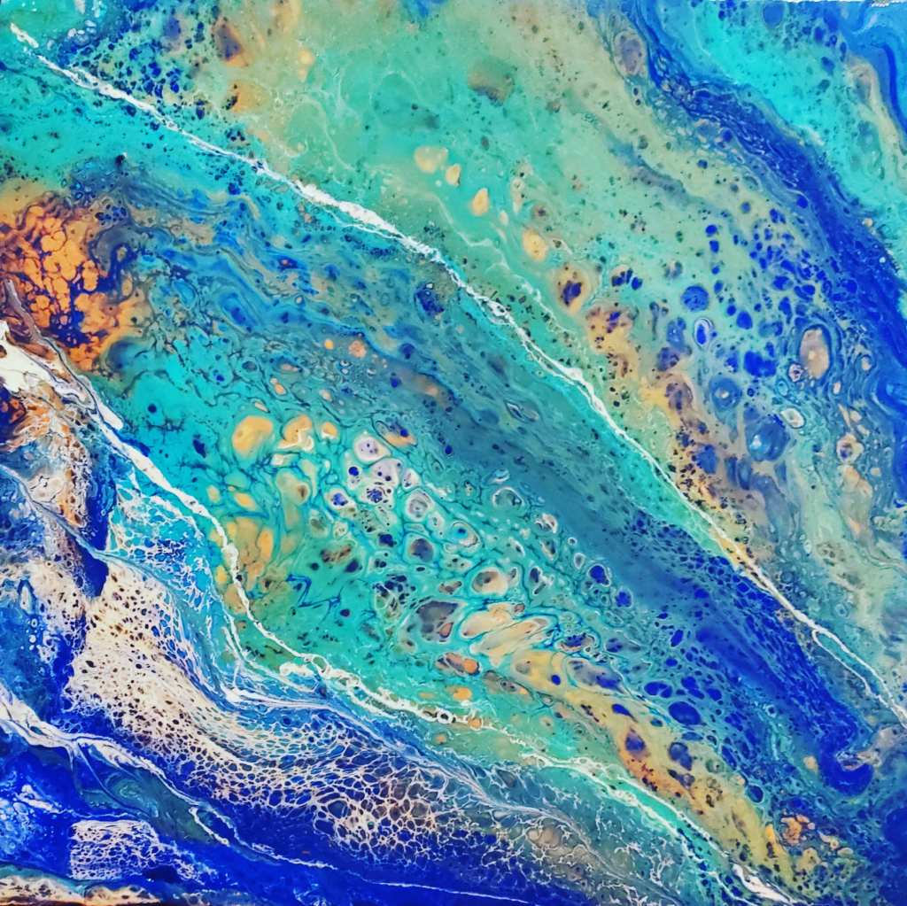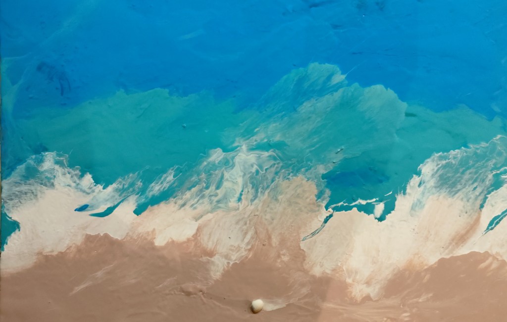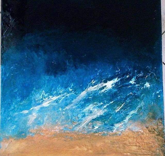 Tela di galleria 60×60 realizzato con acrilico pasta modellante e resina epossidca decorativa all’acqua. Il quadro ha un effetto 3D, rappresenta la spiaggia e le sue onde marine. Il quadro è stato venduto privatamente.