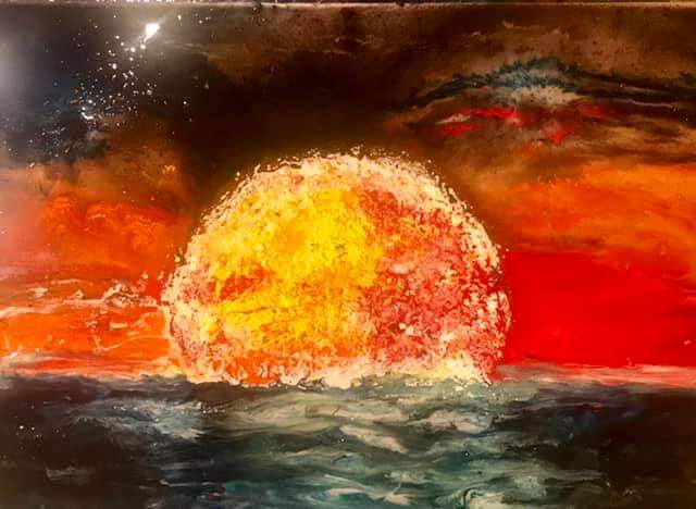 Tela di galleria 50×70 realizzato in resina epossidica decorativa, acrilico e riso da cucina. Il quadro è un Materico in 3D, creato sulla musica del Bolshoy, che con la sua intensità ha generato questo bellissimo tramonto sul mare, con il sole nel suo massimo splendore, esattamente come il crescendo della musica. Il quadro è stato venduto privatamente,