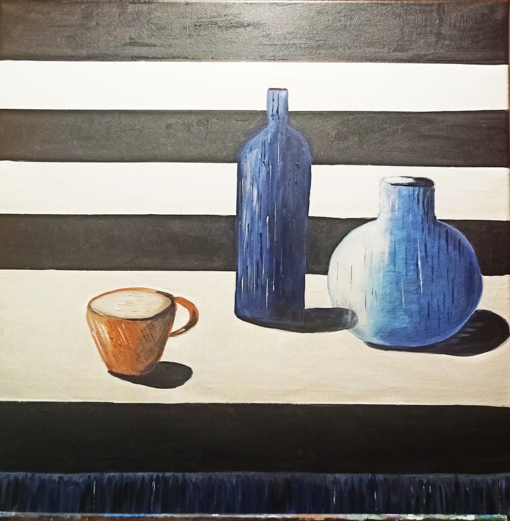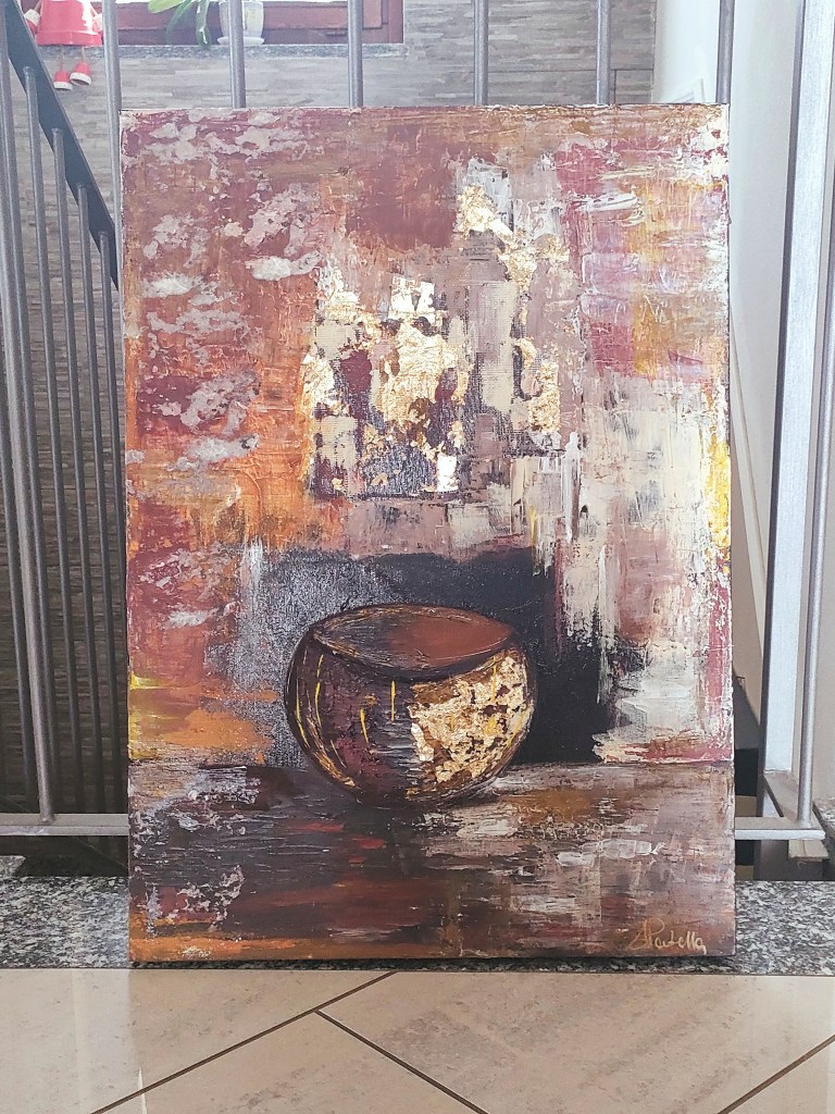 SODDISFATTA! 👍. Tela 50×70 amo la texture mi diverte e mi rilassa miscelare i prodotti sperimentare le nuove tecniche come la fluidpainting ma poi mi soffermo su ciò che mi affascina e mi tiene più concentrata e che soprattutto crea in me qualche emozione📌🤔 Da sempre la passione per le forme arrotondate, così armoniose e che si adattano ad ogni circostanza, un po’ lo stile della mia personalità 👉forse la mia parola chiave è amore? 🤔Il vuoto che riempie il pieno, dunque pronto a contenere , è un po’ come chi vede un bicchiere metà vuoto o metà pieno , perché solitamente vediamo il pieno che riempie il vuoto e non viceversa .Ricco di spiritualità questo vaso ,pronto a ricevere acqua….Amore.Non si può ricevere se non svuotandosi e donandosi.Potreste percepire il vuoto,il vuoto assoluto,senza significato,senza parole,definizioni.I singoli oggetti esistono perché il nostro sistema percettivo li scompone in immagini e le ricompone a modo suo,separando ciò che in realtà è unito come l ‘Amore universale. Comprendere che ciò che percepiamo è illusione e che al di là di essa ci attende una pienezza straordinaria,priva di giudizio e per questo perfetta ed assoluta .AMORE.