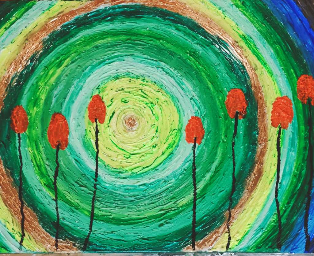 Tela Black 70×100 olio a spatola e pennello, questo quadro nasce in un periodaccio per la nostra Italia e per tutto il mondo. E’ un sempre verde, raffigura la nostra esistenza, non dobbiamo mai perdere di vista la nostra vitalità nonostante siamo temporaneamente fermi. Anche le piante ogni anno fioriscono e ricominciano il loro ciclo vitale, anche noi saremo presto in grado di fare ciò.