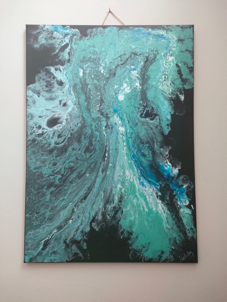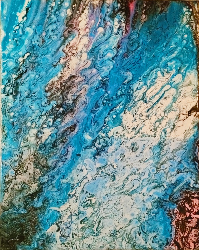 Tela molto suggestiva e più bella dal vivo Cascata d’acqua “. Il tema è sempre l’acqua l’origine della vita e dei nostri pensieri e deve esserlo anche nelle nostre azioni e attenzioni, dato il periodo storico . Sono colpita affascinata, pensate un forte getto d’acqua addosso cosa vi fa ?? Vi squote ? Vi rigenera ? Vi rinfresca ? Vi disseta ? Tela 50×70 realizzata con la tecnica travellingpouringpainting 💪