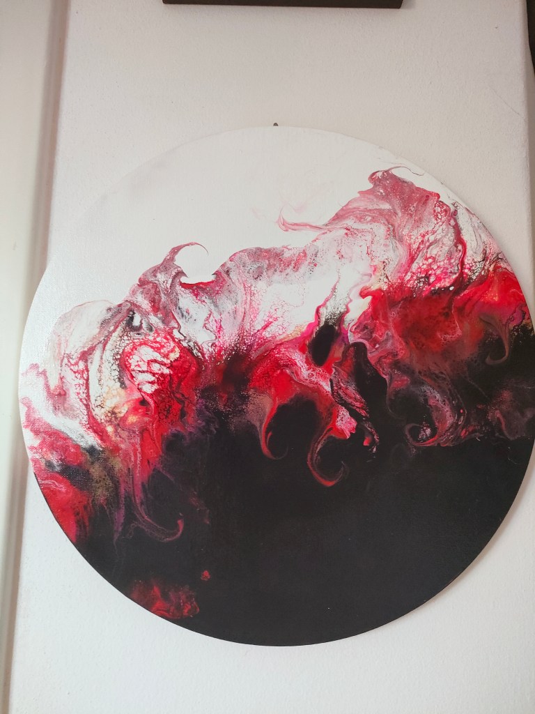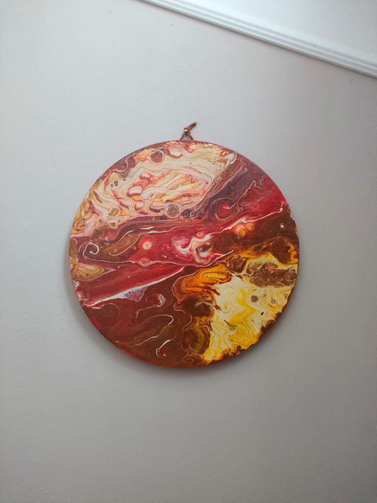Tela rotonda calda così perfetta creata con il bianco e il negativo acrilico.volevo suscitare calore e atmosfera infatti lo messo in camera da letto .creato con la tecnica del dutchpour in vendita a 250 euro
