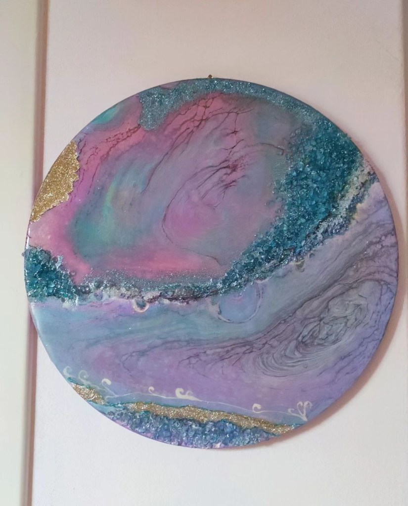 Una delle tele più belle che io abbia mai creato con acrilico tecnica kissingcup più glitter e infine resinato con cristalli di quarzo azzurri . Venduto