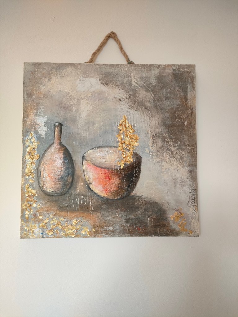Questa tela 50×50 creata in texture di fondo con pasta destrutturante e acrilico a spatola più gusci di uovo essiccati e frantumato incollati con vinavil e ricoperti in oro acrilico . E stato molto divertente se vogliamo anche un po’ natalizio 🙋🌲in vendita a 550 euro