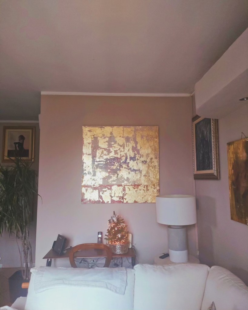 Autumn in CountryLand è Appeso! Me gusta ,me gusta ci vorrebbe una minimal cornice argentata , la farò🖌️🎨, molto.aoddifatta di questa atela 50×70 l’ho creata osservando una giornata strepitosa nei boschi su in valle Antrona con mio marito i primi di novembre e mi sono rimasti impressi i colori riflessi nell’ acqua del lago.